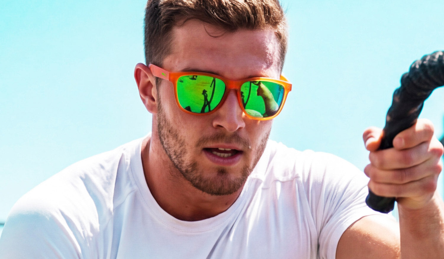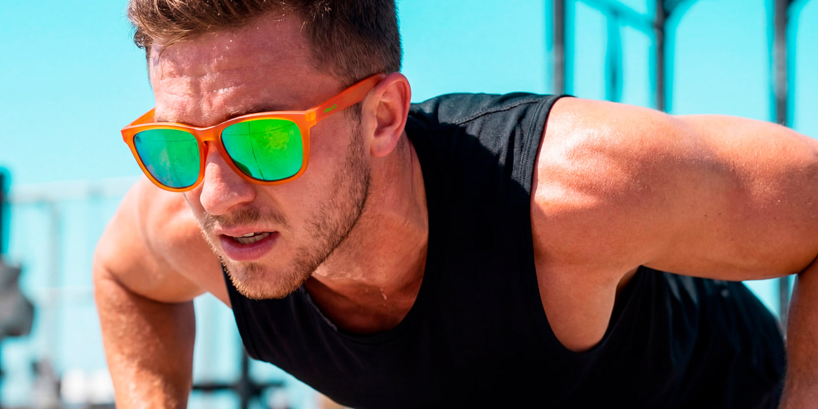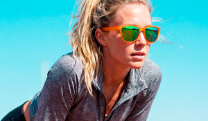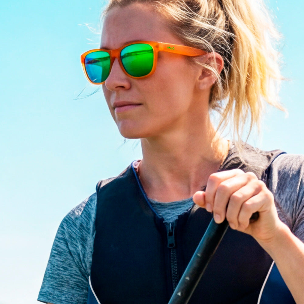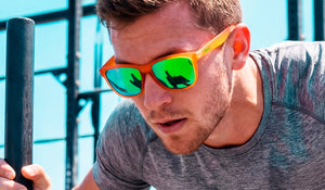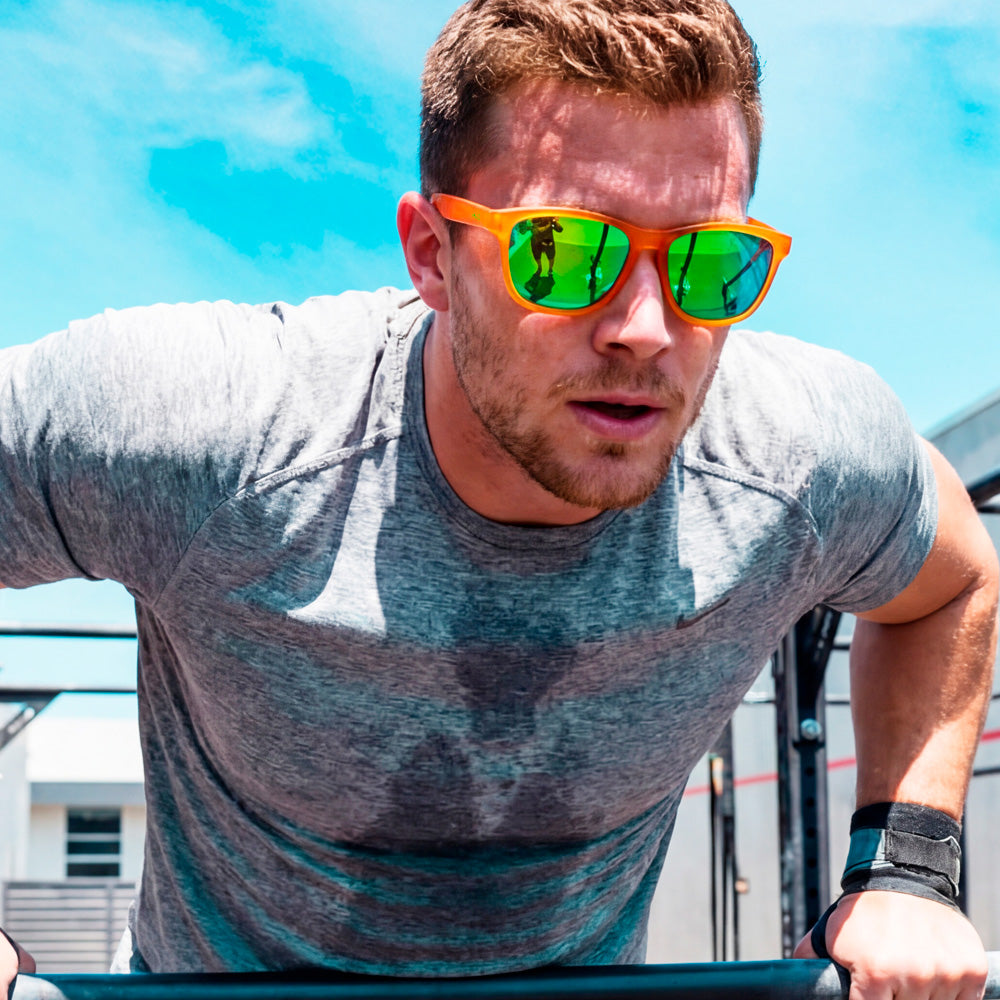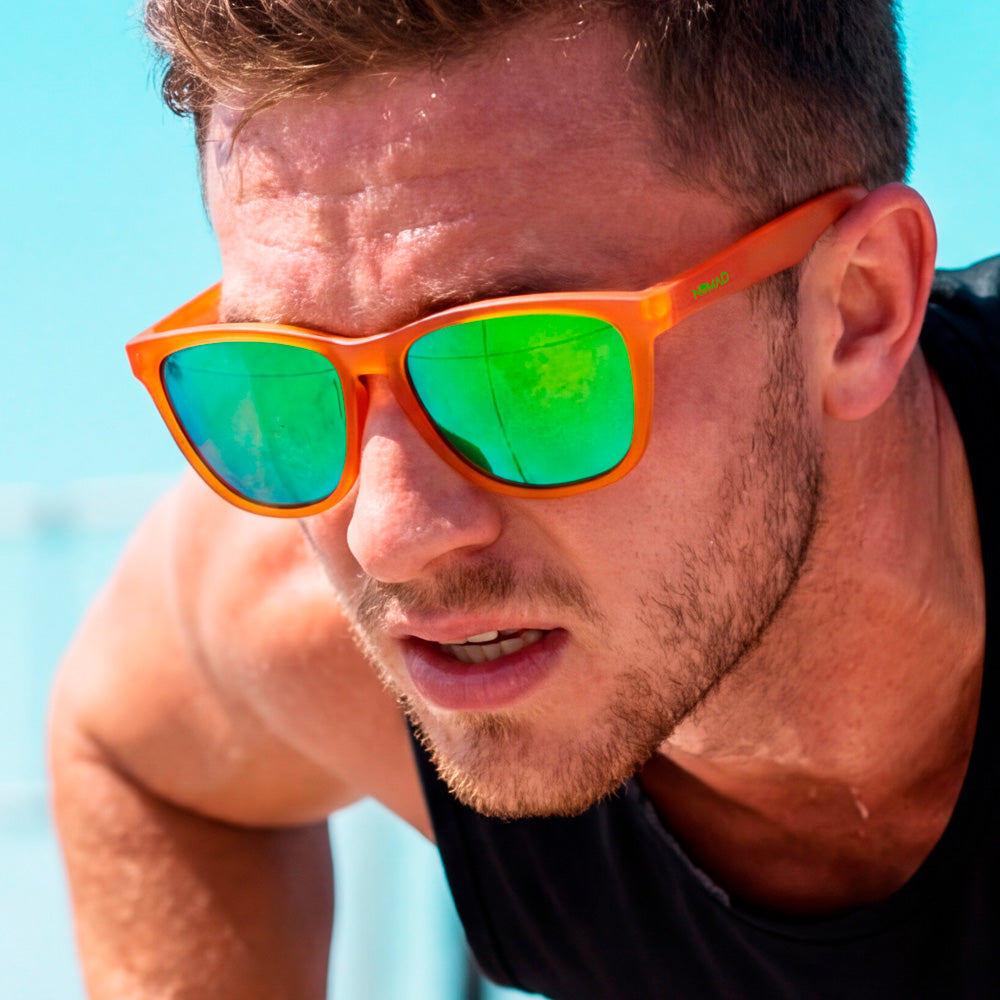 The Aperol Spritz Activ. Because nothing says "I've got my life together" like crushing a workout in sunglasses named after a drink. Bold orange frame, electric green lenses, you'll look this good whether you're on rep 10 or round 3.